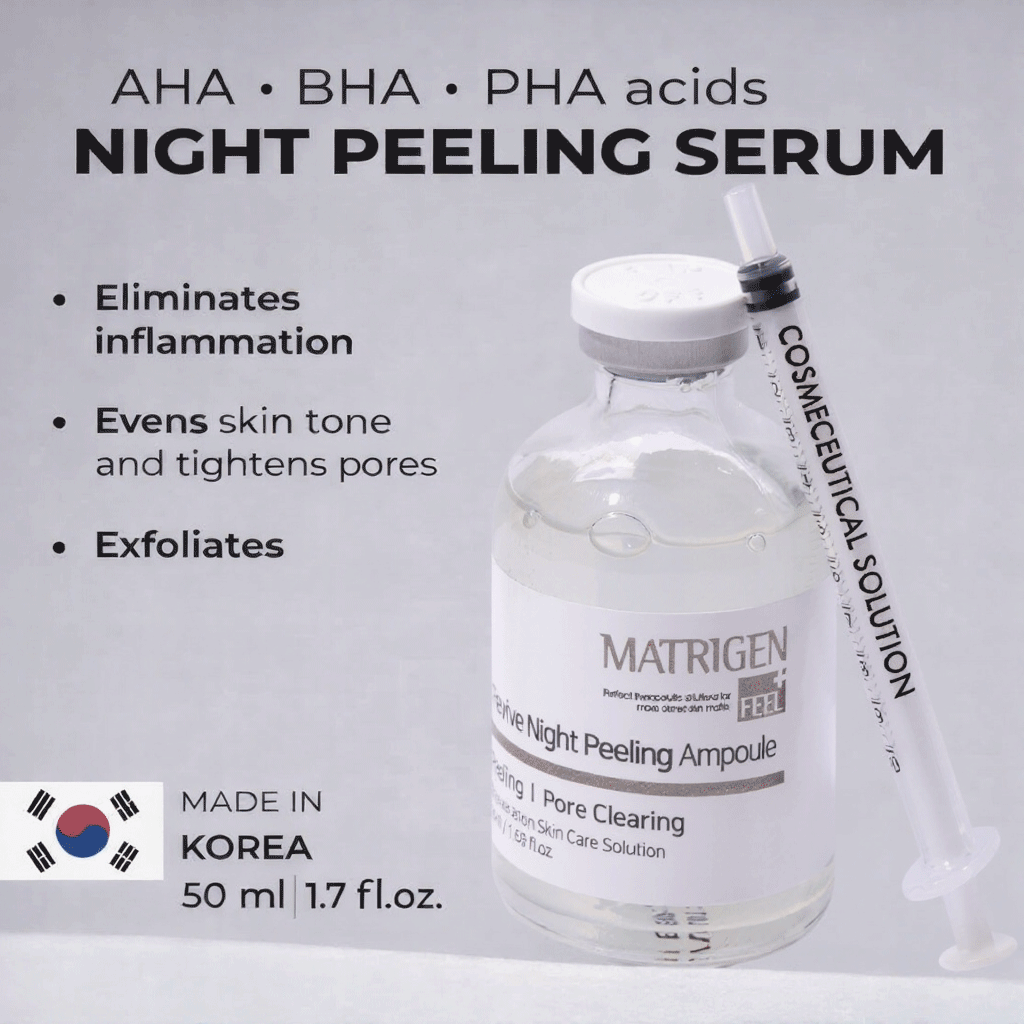 Overnight resurfacing peeling ampoule with AHA, BHA, and fruit acids that exfoliate dead skin cells, brighten dull tone, clear pores, and smooth fine lines for a refreshed, radiant complexion by morning.